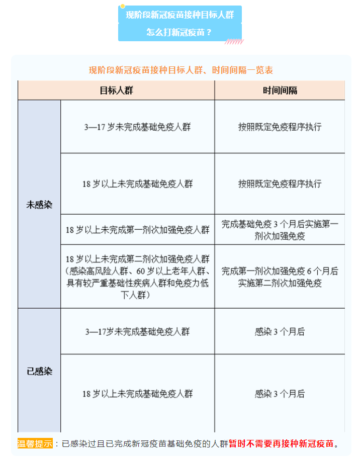 溫馨提示:已感染過且已完成新冠疫苗基礎免疫的人群暫時不需要再接種新冠疫苗。