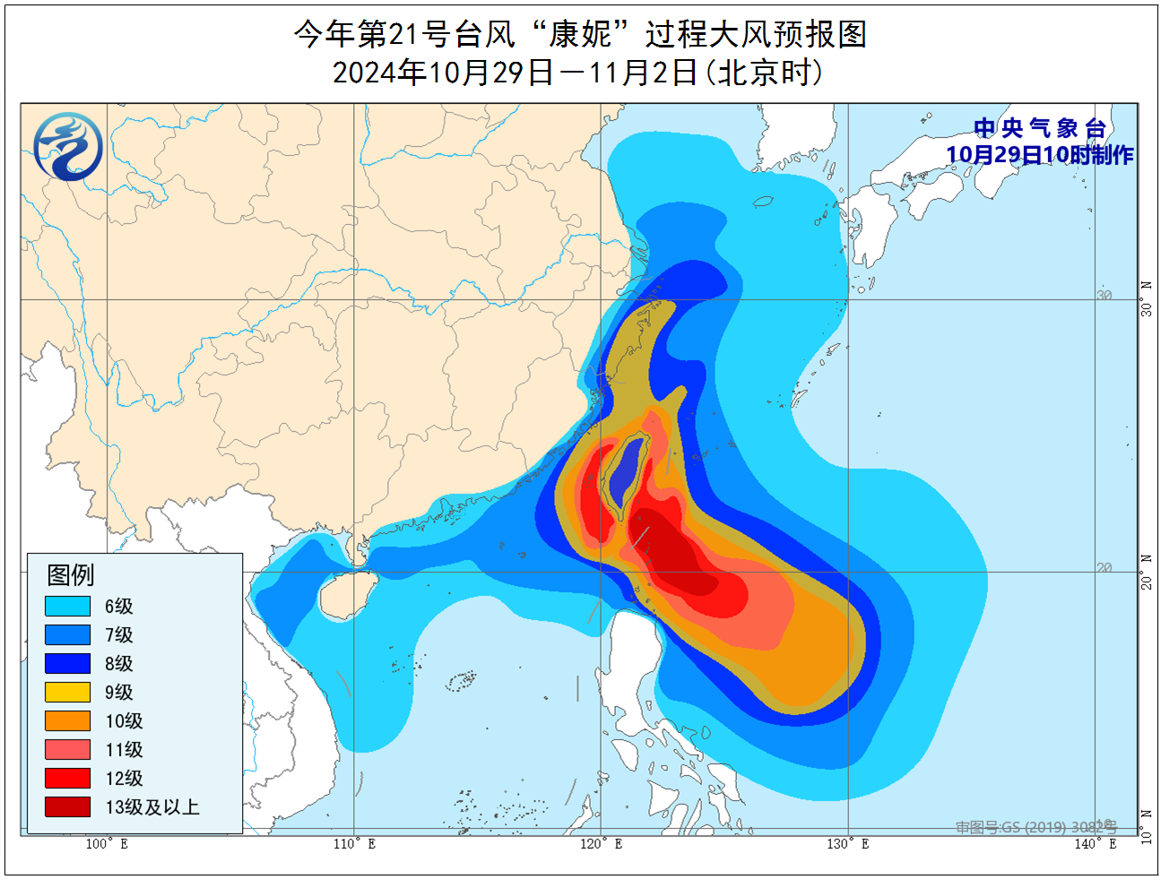 大風預報:29日至11月2日,受冷空氣和“康妮”的共同影響,黃海南部、東海大部、釣魚島附近海域、南海北部、北部灣、瓊州海峽、臺灣海峽、巴士海峽、臺灣以東洋面及我國東南沿海地區有6~8級大風,陣風9~10級;其中,東海西部、南海東北部、臺灣海峽、臺灣以東洋面、巴士海峽、浙江沿海、福建沿海、臺灣島沿海的風力有9~12級,陣風13~14級;“康妮”中心經過的附近海域或地區的風力有13~17級,陣風17級以上(見圖2)。