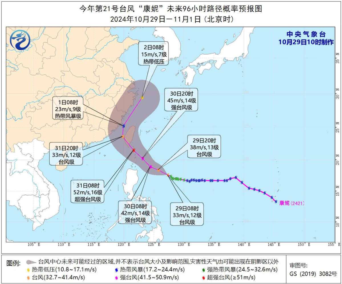 摘要:臺風“康妮”最強可達超強臺風級(52~58米/秒,16~17級),將于10月31日在臺灣島東部沿海登陸(45~52米/秒,14~16級,強臺風級或超強臺風級),之后向浙閩一帶沿海靠近,轉向東北方向移動,強度逐漸減弱;不排除登陸或擦過福建和浙江沿海的可能性。受“康妮”影響,預計29日至11月2日,我國東南沿海地區及東海、南海北部、臺灣海峽、巴士海峽等海域有大風;30日至11月1日,臺灣島、福建東部、浙江東部等地有大暴雨,臺灣島東部有特大暴雨。