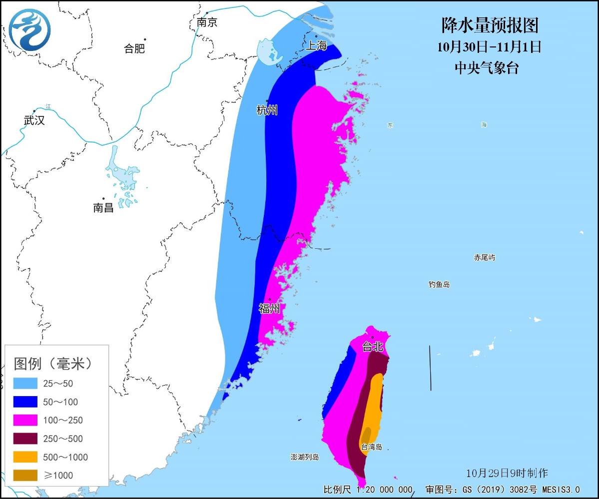 降雨預報:30日至11月1日,臺灣島、福建東部和北部、浙江、上海、江蘇南部有大到暴雨,臺灣島、福建東部、浙江東部等地有大暴雨(累計降雨量100~180毫米,局地250~400毫米),臺灣島東部有特大暴雨(局地降雨量500~1200毫米,見圖3)。臺灣島降雨主要出現在30日至31日夜間,福建、浙江降雨出現在31日至11月1日。