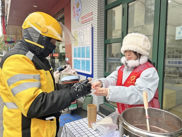 志愿者們分工明確,有的負責盛粥倒茶,有的分發暖貼,有的則主動迎向那些在寒風中匆匆趕來、臉頰凍得通紅的戶外工作者?!澳芎壬弦煌霟狎v騰的臘八粥,既暖胃又暖心!”頂著凜冽寒風和飄落的小雪粒,外賣騎手李向平接過志愿者遞來的臘八粥,開心地說。與他一同感受這份溫暖的,還有陸續前來的快遞員、環衛工人等眾多在寒潮中堅守崗位的人。